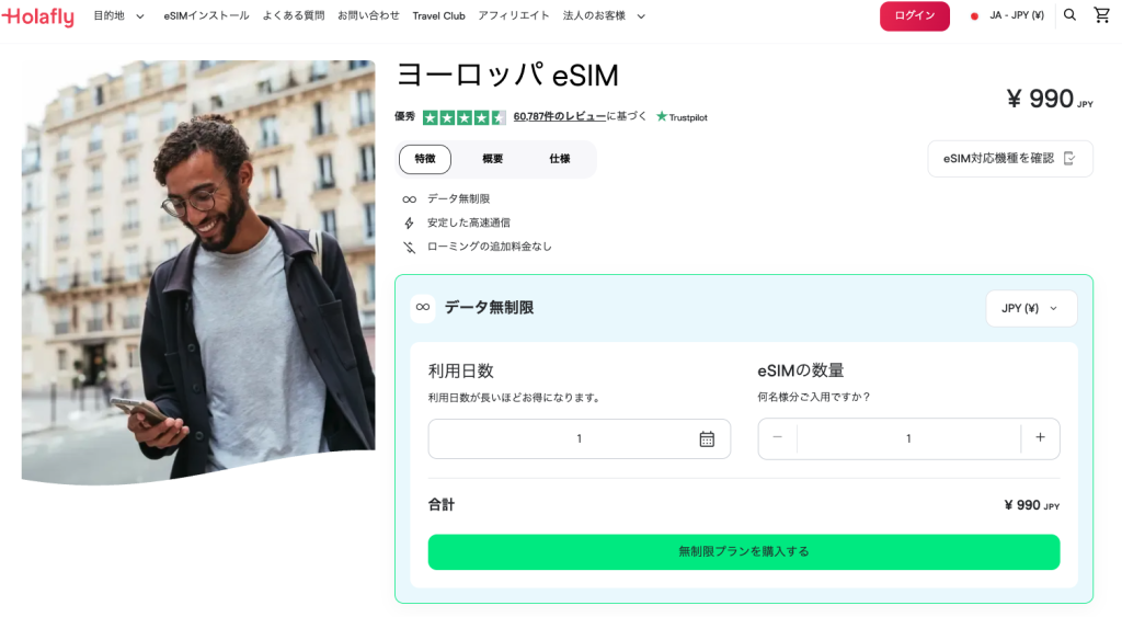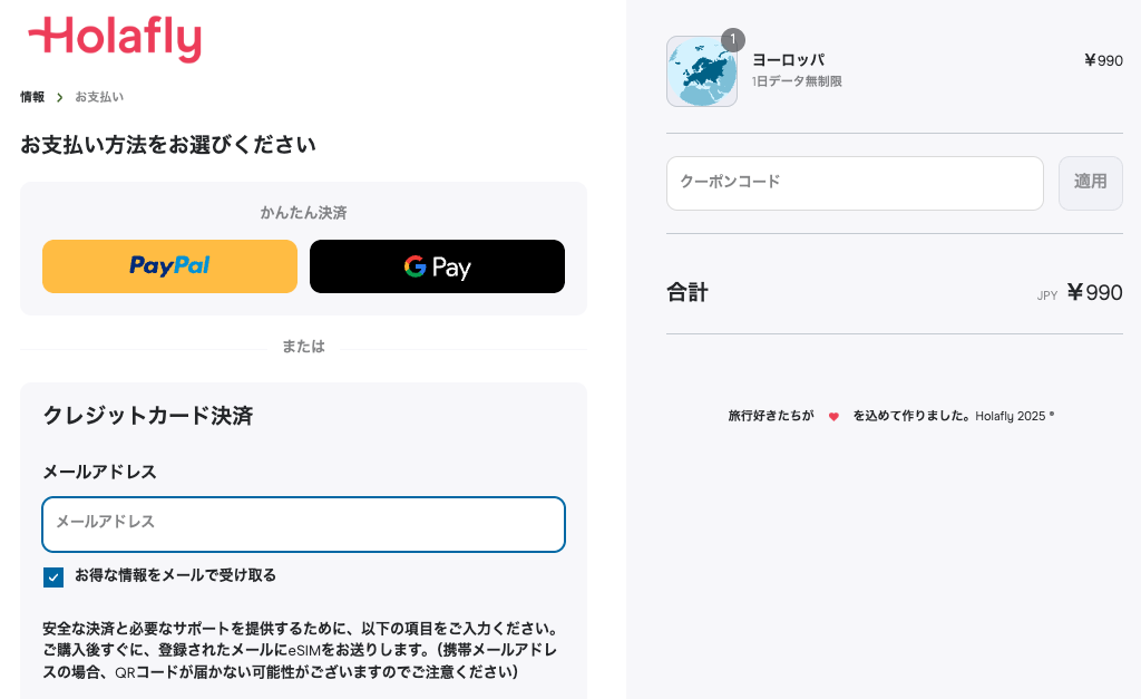 - Holoflyのサイトで国と料金プラン日付を選択して、購入手続き