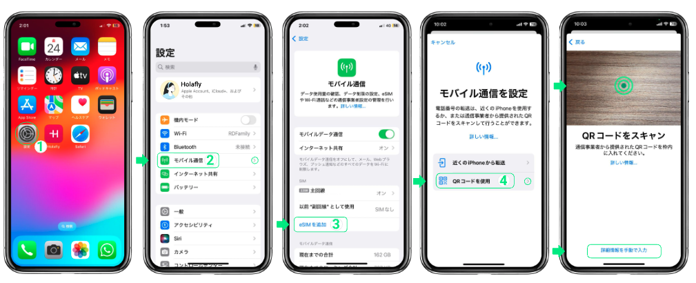 - iPhone → [設定] > [モバイル通信] > [eSIMを追加]