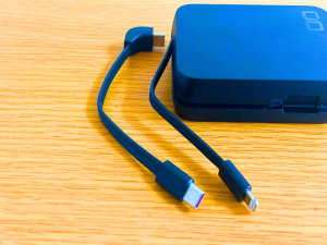 このモバイルバッテリーは、内蔵されているケーブルをLightningポートかUSB-Cで選べます。